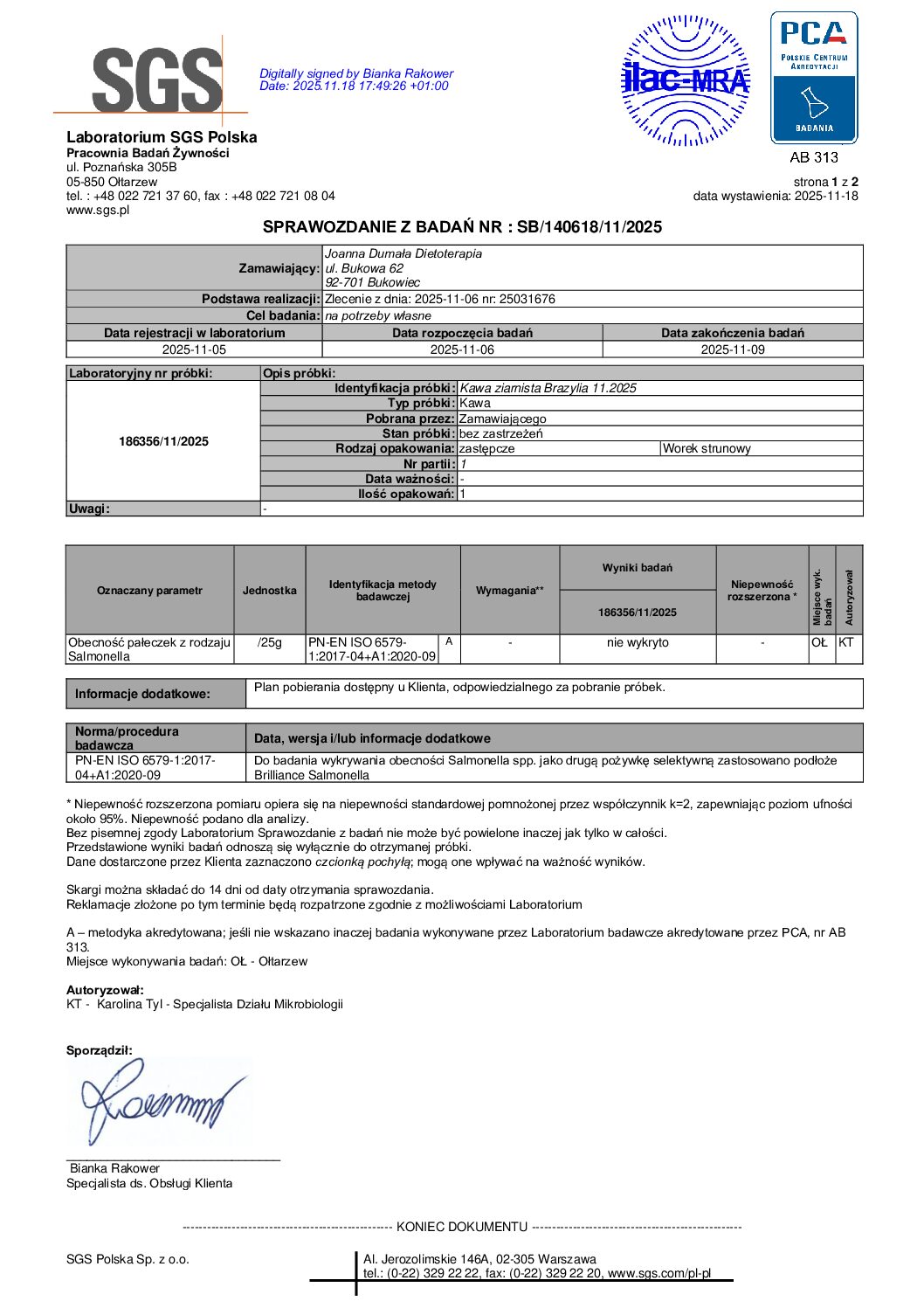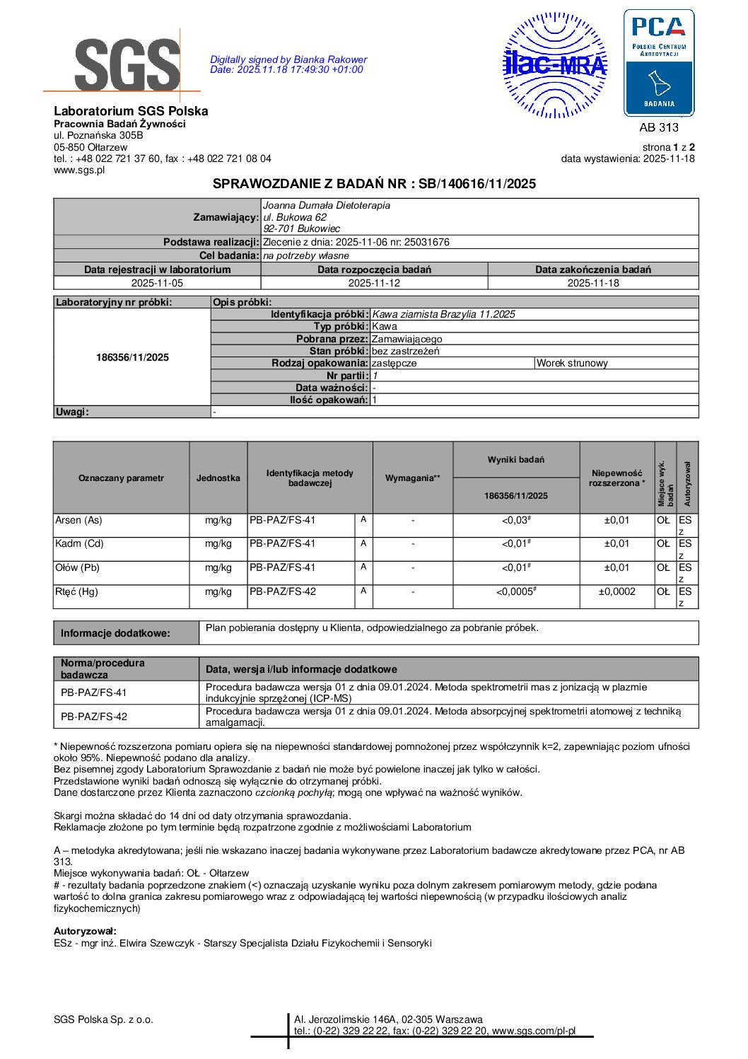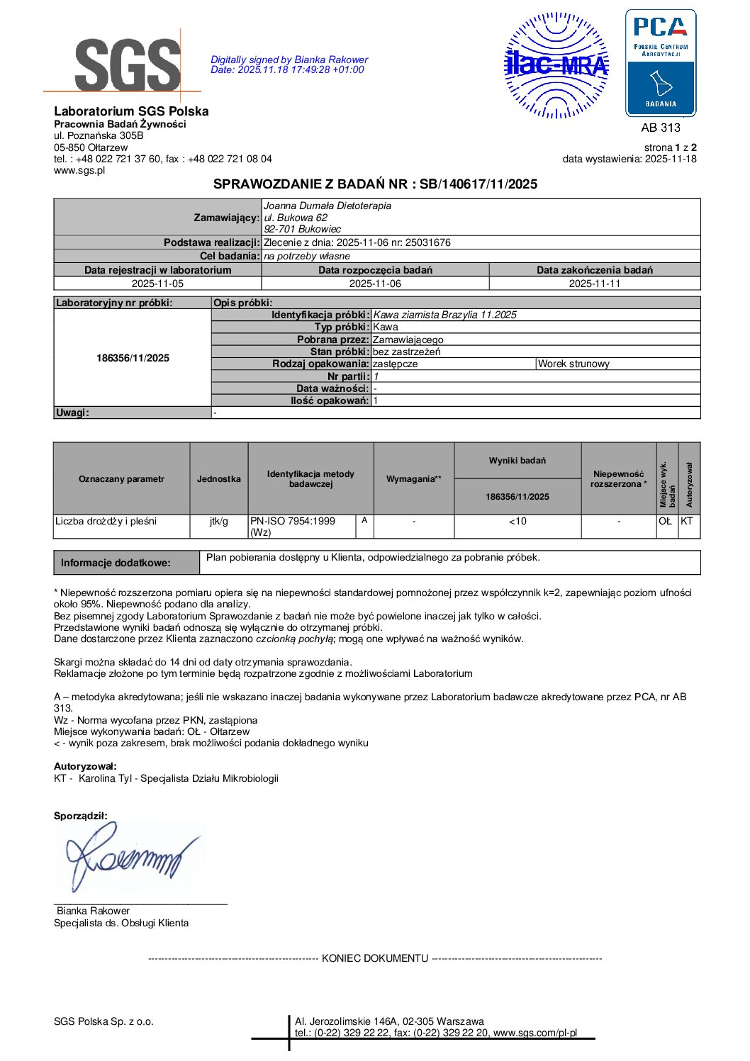 Nasze kawy są badane pod kątem metali ciężkich, a wybrane produkty (w tym kawa) dodatkowo pod kątem mykotoksyn: ochratoksyny A i aflatoksyn. Ma to znaczenie, ponieważ produkty roślinne mogą być narażone na zanieczyszczenia środowiskowe, a surowiec przechowywany w niewłaściwych warunkach (wilgoć, zbyt długi magazyn) może sprzyjać rozwojowi pleśni. Kontrola laboratoryjna daje większą pewność, że wybierasz produkt nie tylko świeży i aromatyczny, ale również o potwierdzonej czystości.