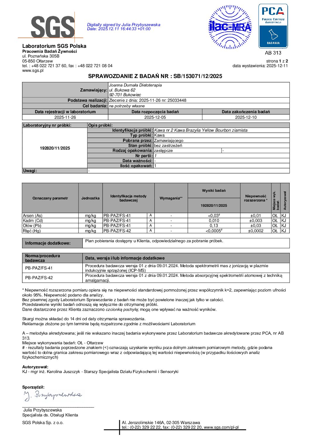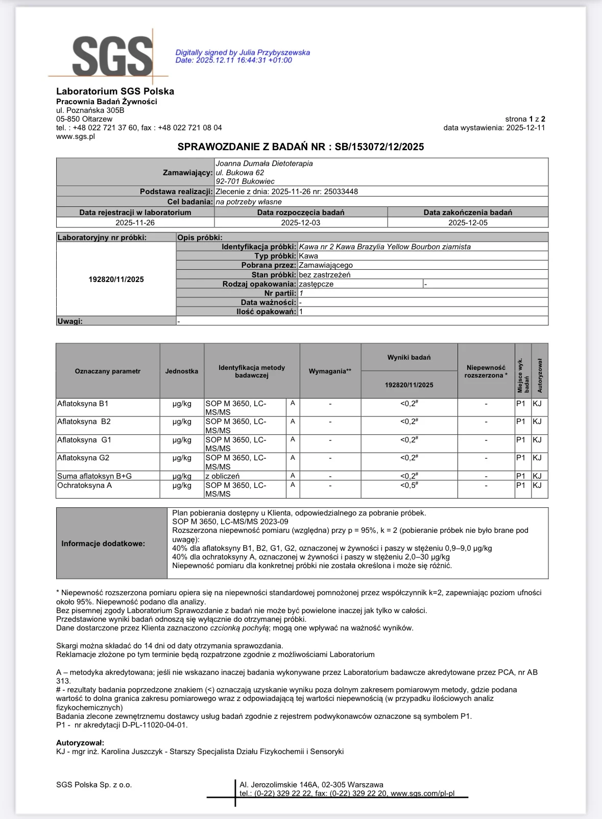 Kawa to produkt roślinny, który bywa narażony na zanieczyszczenia środowiskowe oraz rozwój pleśni w trakcie suszenia i magazynowania surowca. Dlatego nasze kawy są badane pod kątem metali ciężkich, a wybrane produkty (w tym kawa) dodatkowo na obecność mykotoksyn: ochratoksyny A i aflatoksyn. To daje większą pewność, że w filiżance liczy się nie tylko smak, ale też kontrolowana czystość surowca.