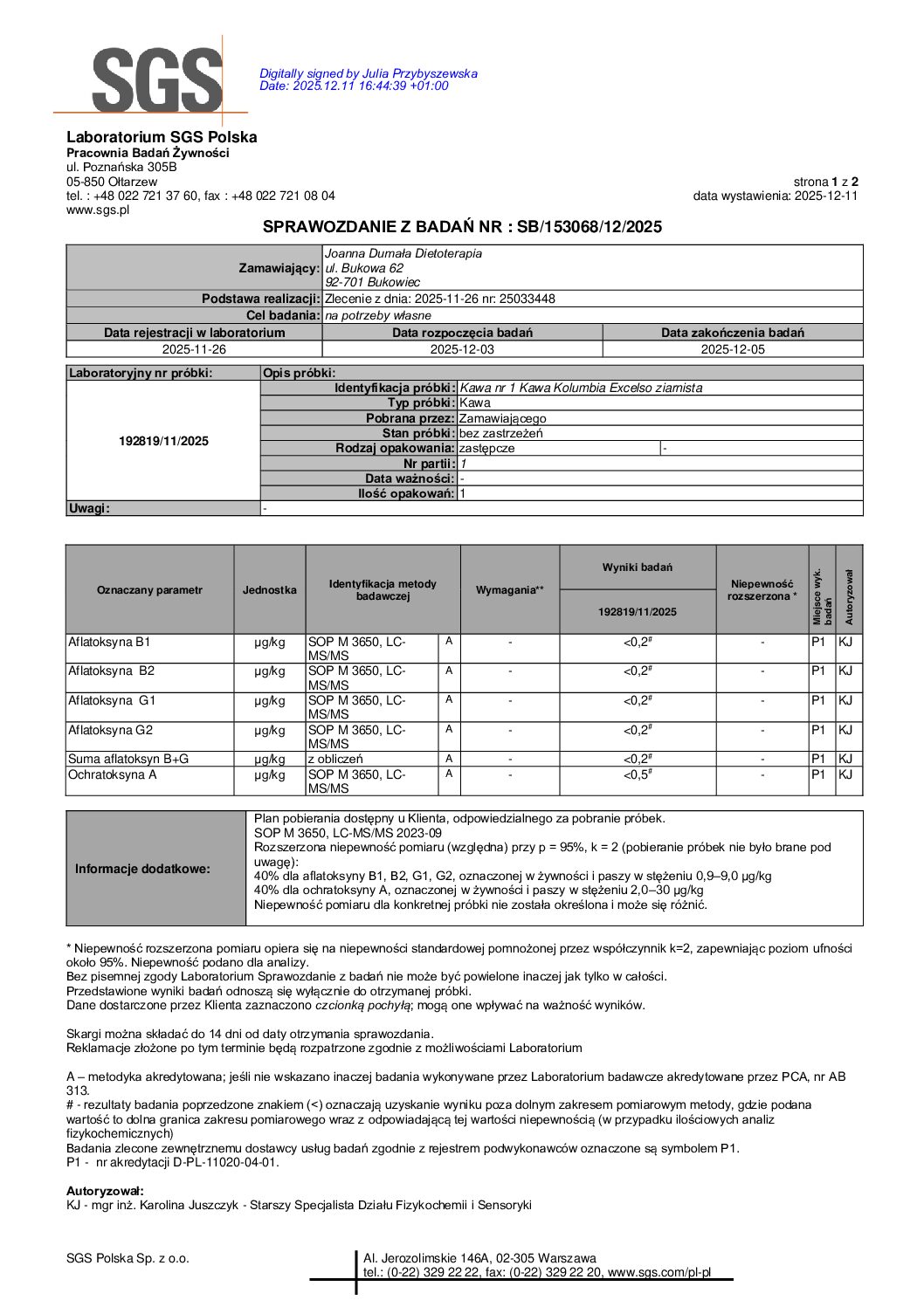 Nasze kawy są badane pod kątem metali ciężkich, a wybrane produkty (w tym kawa) dodatkowo pod kątem mykotoksyn: ochratoksyny A i aflatoksyn. Ma to znaczenie, ponieważ produkty roślinne mogą być narażone na zanieczyszczenia środowiskowe, a surowiec przechowywany w niewłaściwych warunkach (wilgoć, zbyt długi magazyn) może sprzyjać rozwojowi pleśni.